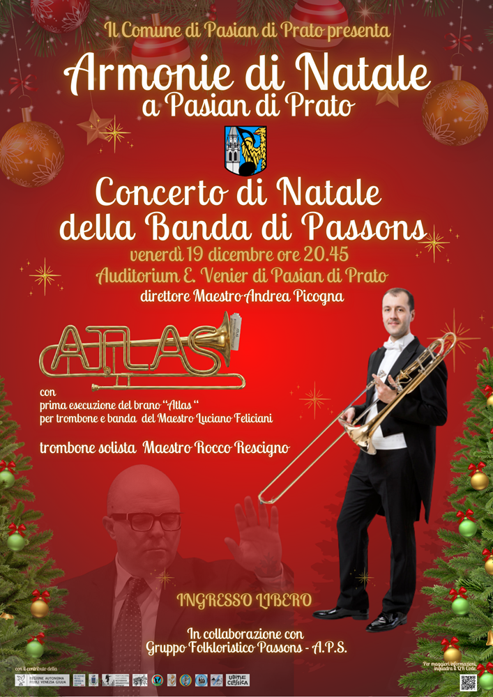 Il Concerto di Natale della Banda di Passons, diretto dal maestro Andrea Picogna, presenta un evento unico: la prima assoluta di “Atlas” per trombone solista e banda, brano commissionato al maestro Luciano Feliciani. Ad interpretarlo sarà Rocco Rescigno, pasianese classe ’92: un ritorno emozionante per il musicista che, dai primi passi nella Scuola di Musica di Passons, è giunto a ricoprire dal 2017 il ruolo di Primo Trombone ai Duisburger Philharmoniker. Una serata di grande musica che esplorerà le migliori sonorità del repertorio bandistico contemporaneo.