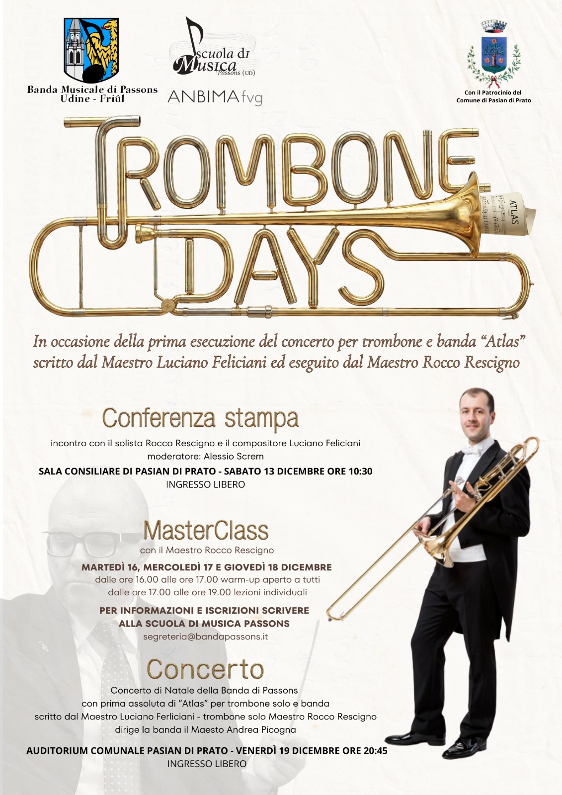 La Banda Musicale di Passons è lieta di presentare i “Trombone Days”, un’iniziativa culturale che unisce formazione musicale di alto livello e produzione artistica originale. L’evento nasce per celebrare il talento del M° Rocco Rescigno, trombonista di fama internazionale che ha mosso i primi passi proprio nella nostra Scuola di Musica , e culminerà con la prima esecuzione assoluta del brano “ATLAS”, scritto dal M° Luciano Feliciani.